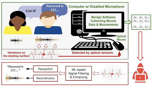 A University of California kutatói bemutatják a Mic-E-Mouse elnevezésű side-channel-támadást, amely rámutat a modern, nagy felbontású optikai egerek érzékelői képesek akusztikus rezgéseket észlelni, így implicit mikrofonként használhatók beszélgetések lehallgatására. A szerzők kísérleti úton igazolják, hogy a legújabb CMOS-alapú szenzorok és a bennük futó képfeldolgozó DSP-k olyan apró felületi vibrációkat is leképeznek, amelyek hangforrásból származnak; ezek a mozgásadatok felhasználói térben, jogosultság nélküli user-space programokból is begyűjthetők.