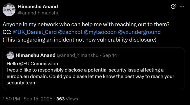 Himanshu Anad kompromittáltnak vélte egy europa.eu-hez – az Európai Unió hivatalos portáljához – tartozó fiókot, amikor rendszeresen figyelte a neki küldött értesítéseket és e-maileket, egy furcsa mozzanatra lett figyelmes, olyan e-mail-visszaigazolást kapott, amely egy krikett-témájú hírlevél feliratkozásáról szólt, pedig sosem iratkozott fel ilyenre. Ez az apró eltérés rögtön gyanút keltett benne, mivel tudta, hogy sem krikett iránti érdeklődése, sem korábbi kapcsolata nem volt ilyen szolgáltatással. Arra a következtetésre jutott, hogy valaki — valószínűleg automatizált bot — külső doménen keresztül regisztrál ilyen feliratkozásokat az ő nevében, ami arra utal, hogy az europa[.]eu-fiókja nincs biztonságban.