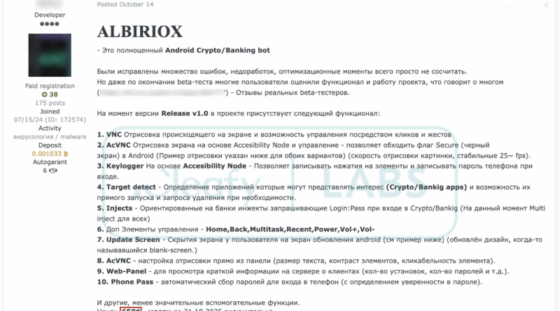 Az Albiriox az Android-platformon terjedő új generációs mobil-trojai, amelyet — ahogy azt a Cleafy kiberfenyezettségi kutatócég azonosította — 2025 őszén kezdtek forgalmazni, mint Malware-as-a-Service (MaaS). A háttérben álló szereplők — a fórumokon használt nyelvezet és infrastruktúra alapján — orosz nyelvűek lehetnek.