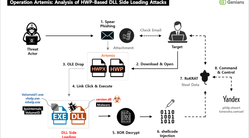 A Genians Security Center egy az APT37 csoporthoz köthető, Artemis nevű kampányt azonosított, amelyben a támadók a dél-koreai Hangul Word Processor (HWP) fájlformátumot használták ki első lépésként, majd DLL side-loading technikával rejtették el a rosszindulatú kódrészleteket egy többfázisú támadási láncban.