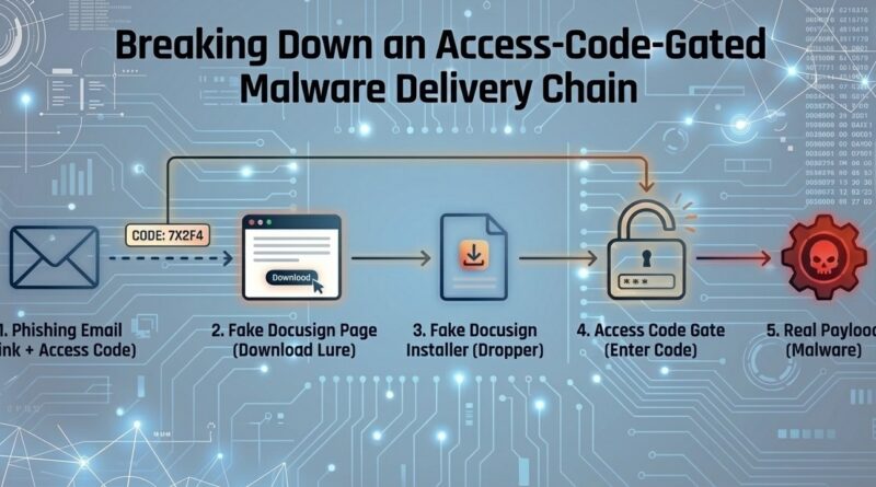 A támadás tipikus kezdete egy hamisított DocuSign-hoz kapcsolódó phishing e-mail, amely egy meggyőzően kinéző weboldalra irányítja az áldozatot. Ez a hamis oldal letöltésre kínál egy DocuSign_PackageInstaller.exe nevű futtatható fájlt, amely bár első ránézésre nem mutat viselkedési jeleket, szofisztikált rejtőzködési mechanizmusokat tartalmaz. A kutatók azt tapasztalták, hogy a dinamikus (sandbox-ban futtatott) elemzés önmagában nem volt elegendő a viselkedés feltárásához, mivel a kód access kódot kér és idő-ellenőrzéseket végez, amelyek lelassítják vagy blokkolják a futást automatizált környezetben.