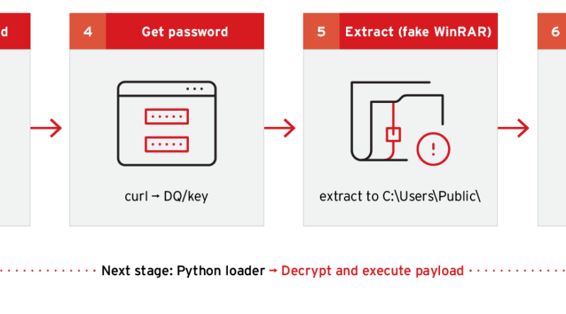 A fertőzési lánc többlépcsős és kifejezetten detekció-ellenálló. A kezdeti payload egy titkosított fájlt tölt le, amely PDF-nek álcázott, majd a visszafejtési kulcsot dinamikusan, C2 infrastruktúráról szerzi meg. A kibontáshoz egy átnevezett, WinRAR komponenst használ, ami klasszikus living-off-the-land megközelítés.