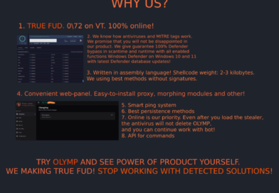 Az Outpost24 KrakenLabs kutatása az Olymp Loader Malware-as-a-Service-koncepciót mutatja be. Az assemblyben írt, FUD-nek (Fully UnDetectable) hirdetett loaderként és crypterként árult