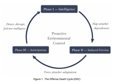 A The Cyber Defense Review-ban megjelent publikáció egy doktrinális váltást ismertet, amely szerint az Offense Death Cycle koncepció lényege az, hogy